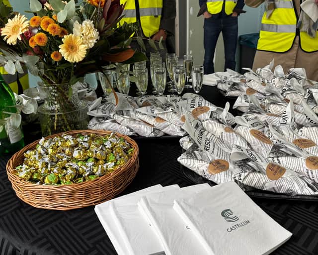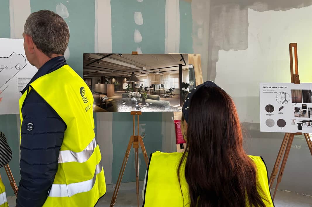 I slutet av september bjöds medarbetare in till en visning på byggarbetsplatsen. Där presenterades visionsbilder, materialval och exempel på återbrukade byggdelar. Rundvandringen förgylldes av bubbel och lättare lunch tillsammans med representanter från Castellum, arkitektbyrån Semrén & Månsson samt entreprenören BRA Bygg.