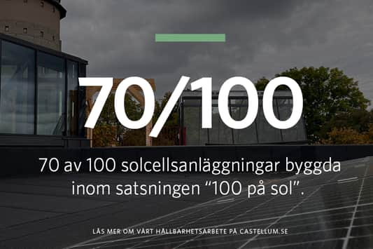 När vi på Castellum bygger nytt bygger vi för en hållbar framtid. Alla våra nybyggnadsprojekt miljöcertifieras enligt Miljöbyggnad eller motsvarande. Det betyder att våra hyresgäster bland annat kan se fram emot en hälsosam arbetsmiljö med sunda material och en effektiv energianvändning. Och Miljöbyggnad är ett svenskt miljöcertifieringssystem som bedömer byggnader utifrån tre fokusområden: