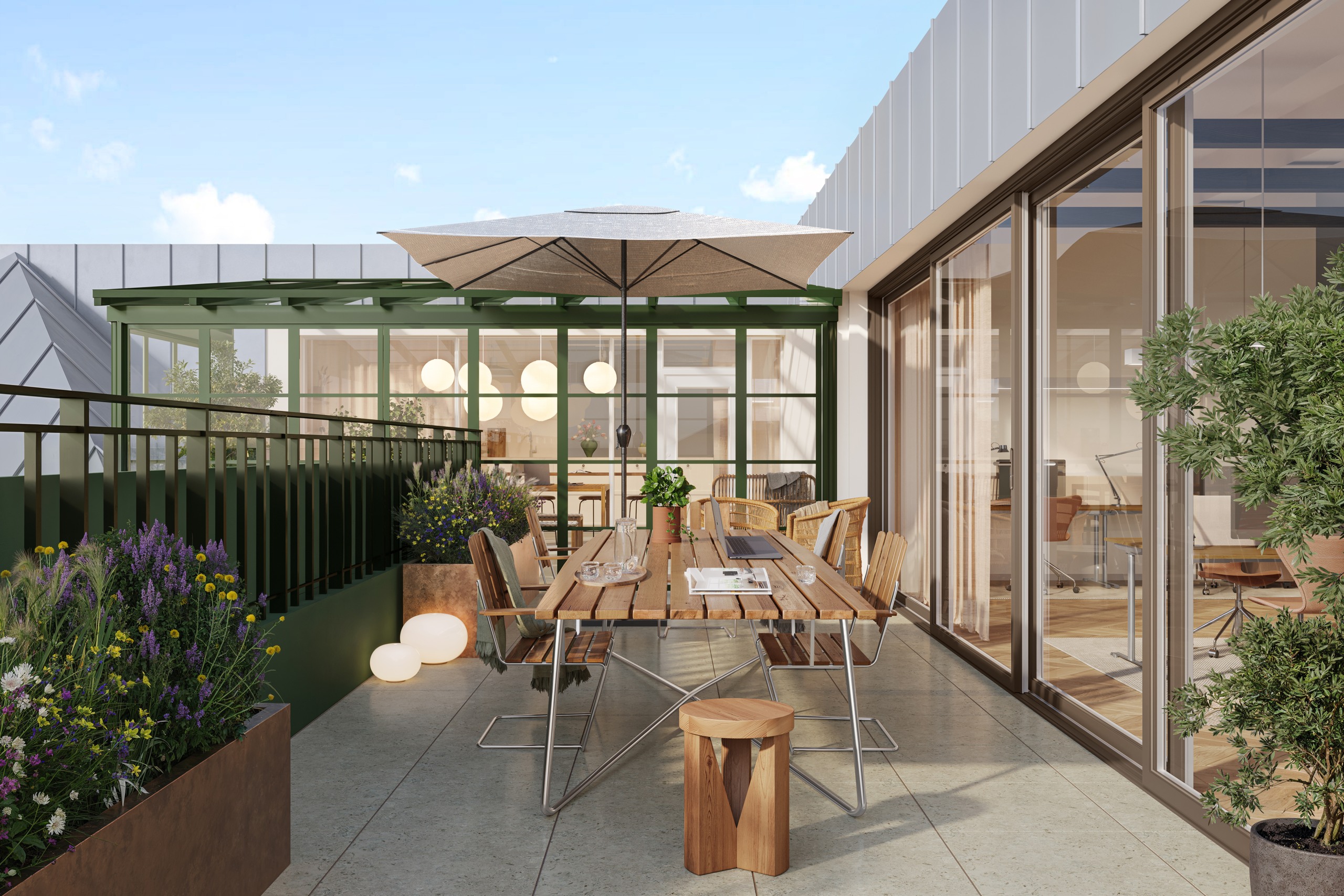 Längst upp finns en vindsvåning. Denna kommer att förvandlas till en modern kontorsyta med unika inslag. Delar av taket kommer att byggas om för att göra plats för en takterrass med orangeri. Här har hyresgästerna vacker utsikt över takåsarna, med plats för både umgänge och arbete i orangeriet.