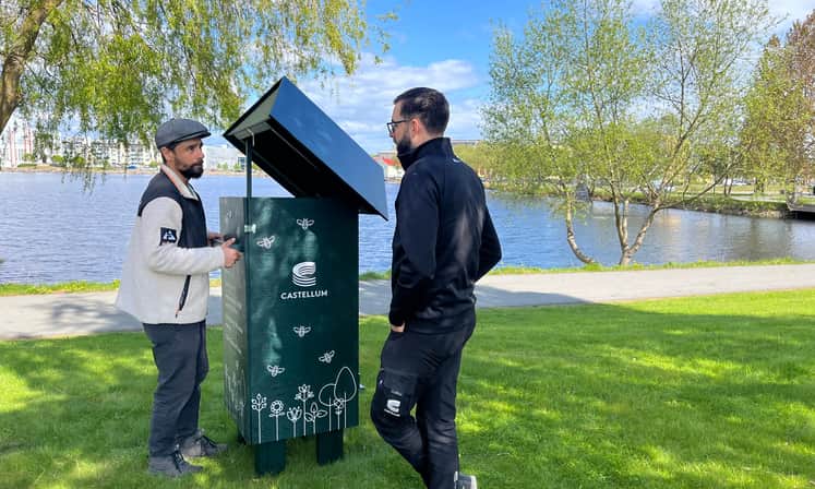 Bikupan är ett exempel på hållbara satsningar vi gör vid Öriket. Vi på Castellum har också beställt bänkar gjorda av överbliven betong och återbrukat trä, som vi kommer placera ut för sköna pauser längs vattnet. Vi har även anlagt en helt ny plantering med vårlökar vilket inte bara blir en fröjd för ögat utan också mat åt bina. Och får bina käk blir det som bekant honung. Biatrix och hennes kollegor beräknas leverera omkring 100 burkar honung i år.
