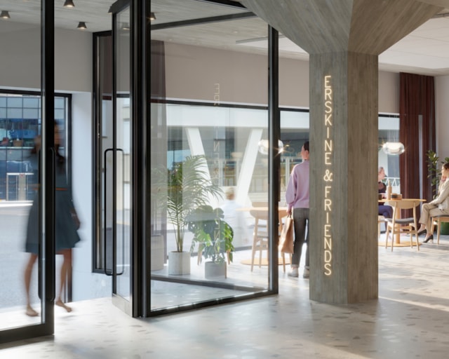 Den gemensamma lobbyn är Erskine & friends hjärta. Det är den som skapar puls från morgon till kväll, och som knyter ihop husen med varandra och gatan med parkutgången. Receptionen och loungen är en naturlig mötesplats för både vänner i huset och besökare, och samtidigt navet till allt det andra som gör det här huset till vad det är. För en arbetsplats är så mycket mer än kontoret, den är ett helt arbetsliv.
