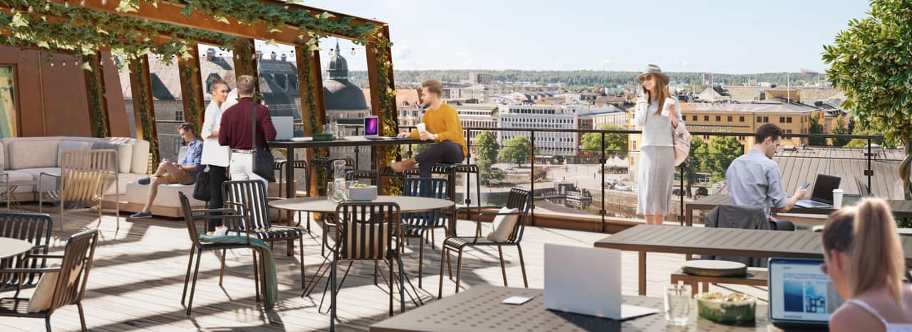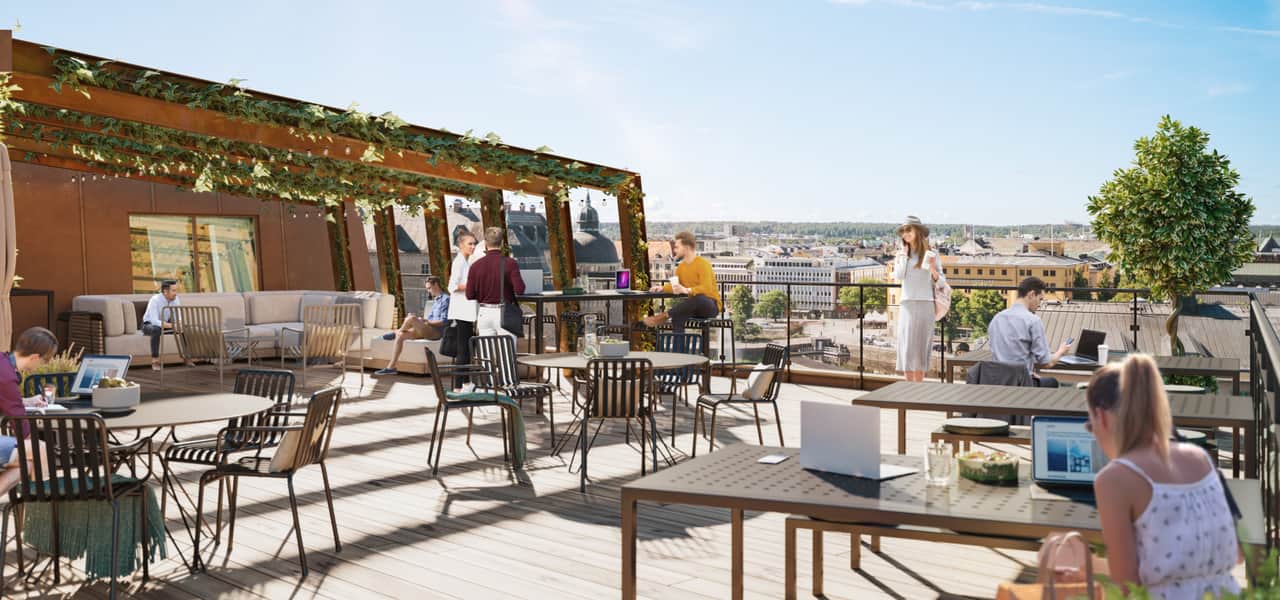 Högst upp i huset kan ni nyttja generösa konferensrum och under våren, sommaren och tidig höst möts ni även av en oslagbar takterrass, med utsikt över hela stan. För avkoppling och utsiktsnjut eller möten i vårt utomhuskontor.