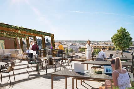 På taket kommer det att finnas en stor takterass med fantastisk utsikt över Örebro slott och Örebro city. Här blandas umgängesytor med utomhuskontor som är ett hälsosamt komplement till det vanliga kontoret.