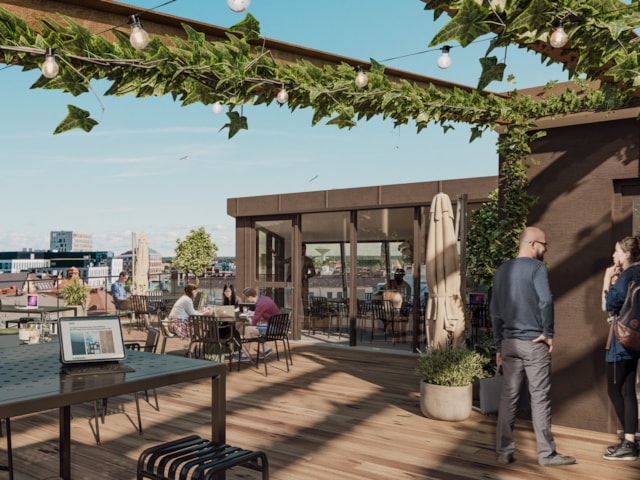 På taket kommer det att finnas en stor takterass med fantastisk utsikt över Örebro slott och Örebro city.  Här blandas umgängesytor med utomhuskontor som är ett hälsosamt komplement till det vanliga kontoret.