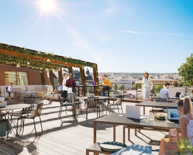 Högst upp i huset kan ni nyttja generösa konferensrum och under våren, sommaren och tidig höst möts ni även av en oslagbar takterrass, med utsikt över hela stan. För avkoppling och utsiktsnjut eller möten i vårt utomhuskontor.