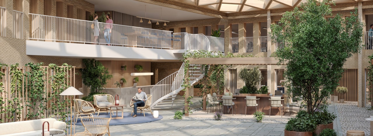 Hjärtat i projektet är den inglasade atriumgården på entréplanet, där det finns plats för större konferenser och evenemang. Här blandas mötesplatser med funktionella ytor. Hyresgäster som nyttjar hela huset eller de tre första våningarna får också möjlighet att använda atriets ytor för den egna verksamheten.