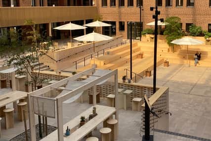 På Torget inne på Werket är det väldigt ljust på grund av att taket släpper igenom dagsljuset. Det står parasoller utställda på olika platser och betongborrkärnor från byggplatsen har blivit parasollfötter och bord.