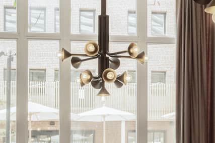 Belysningsarmaturer har återanvänds och satts på nya platser i huset. Upp och nervända och numera takbelysning. Tidigare fasadbelysning har återanvänds på nya platser i huset och av metallskrot har man skapat belysningsarmatur över receptionen.