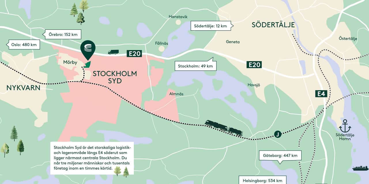 Stockholm Syd utvecklas till ett av Sveriges största områden för industri och logistik – mycket tack vare sitt strategiska läge. Här finns E20 i direkt anslutning och nära koppling till E4, bara 30 minuter från Stockholm city och med smidiga transporter mot Mälardalen, Göteborgs och Helsingborgs hamnar, samt västra Sverige och Oslo. När Förbifart Stockholm står klar 2030 blir kopplingarna till norra och västra Stockholm ännu bättre. Södertälje hamn med sin kombiterminal skapar en viktig länk mellan sjö, väg- och järnvägstransporter. Samtidigt går Svealandsbanan genom området, med industrispår som gör det möjligt att flytta gods från väg till järnväg – en viktig del i mer hållbara transportflöden. Sammantaget ger det ett läge som är svårt att slå: nära marknaden, nära infrastrukturen och med goda förutsättningar att växa. När Stockholm Syd är fullt utvecklat blir det en av regionens viktigaste noder för industri och logistik.